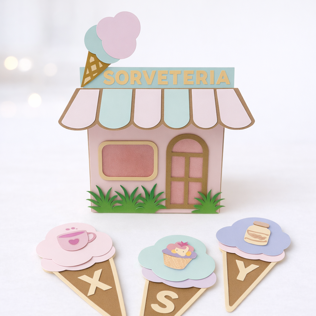 O tamanho é 7cm (A)x 7cm (C)x5cm (L), caixa sorveteria, educativa, com cards e imagens para cada letra do alfabeto.