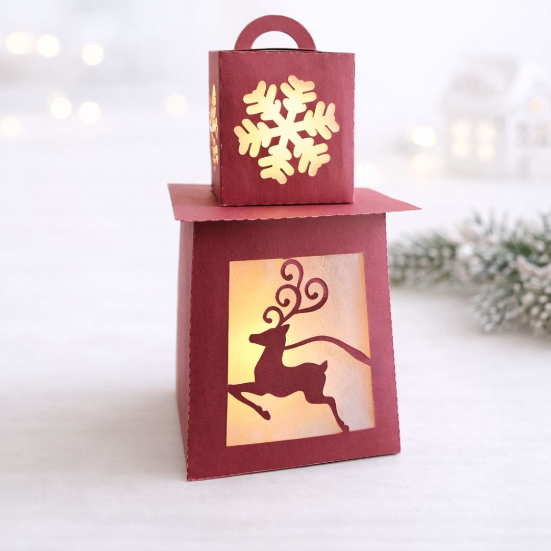O tamanho caixa maior é 7cm (A)x 7cm (C)x5cm (L), caixa menor 6cm (A)x6cm(L)x6cm (C) a lanterna fica ótima em uma mesa de natal.