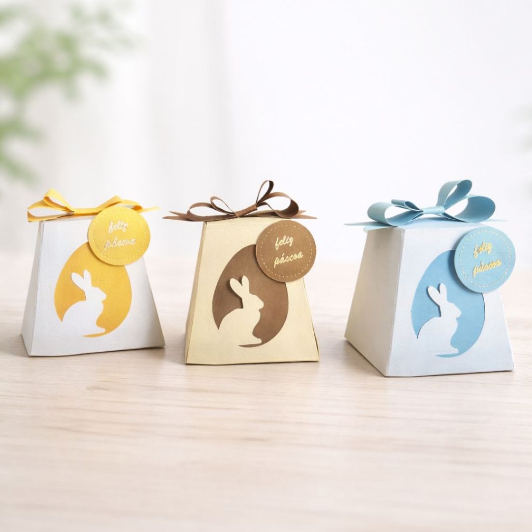 O tamanho original é 6cm (A) x 5cm (L) x 5cm (C), ideal para rechear com mini ovos de páscoa.